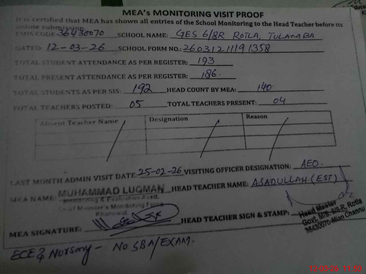 | Attendance Register | Head Teacher | MEA with School | Visit Proof |