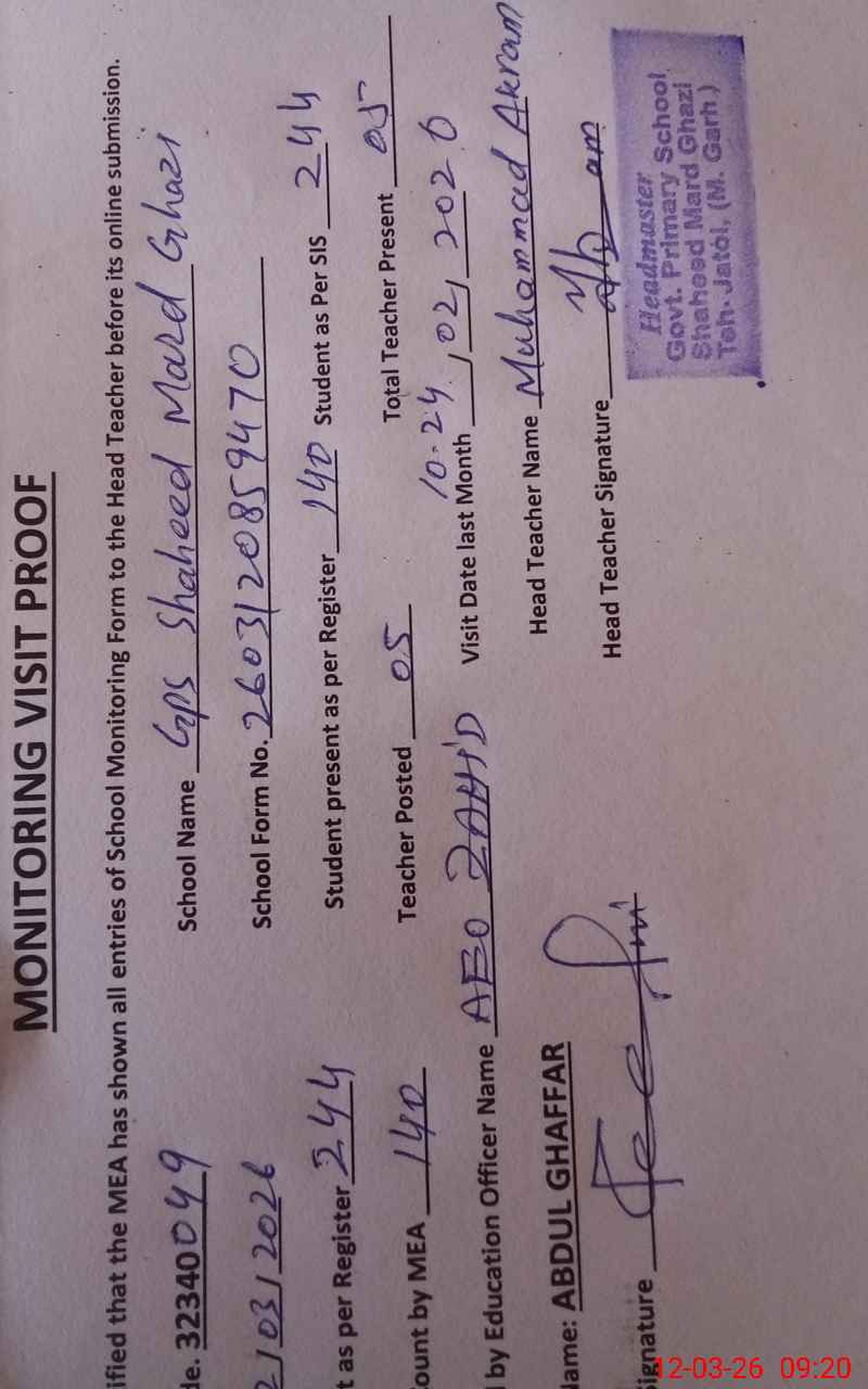 | Attendance Register | Head Teacher | MEA with School | Visit Proof |