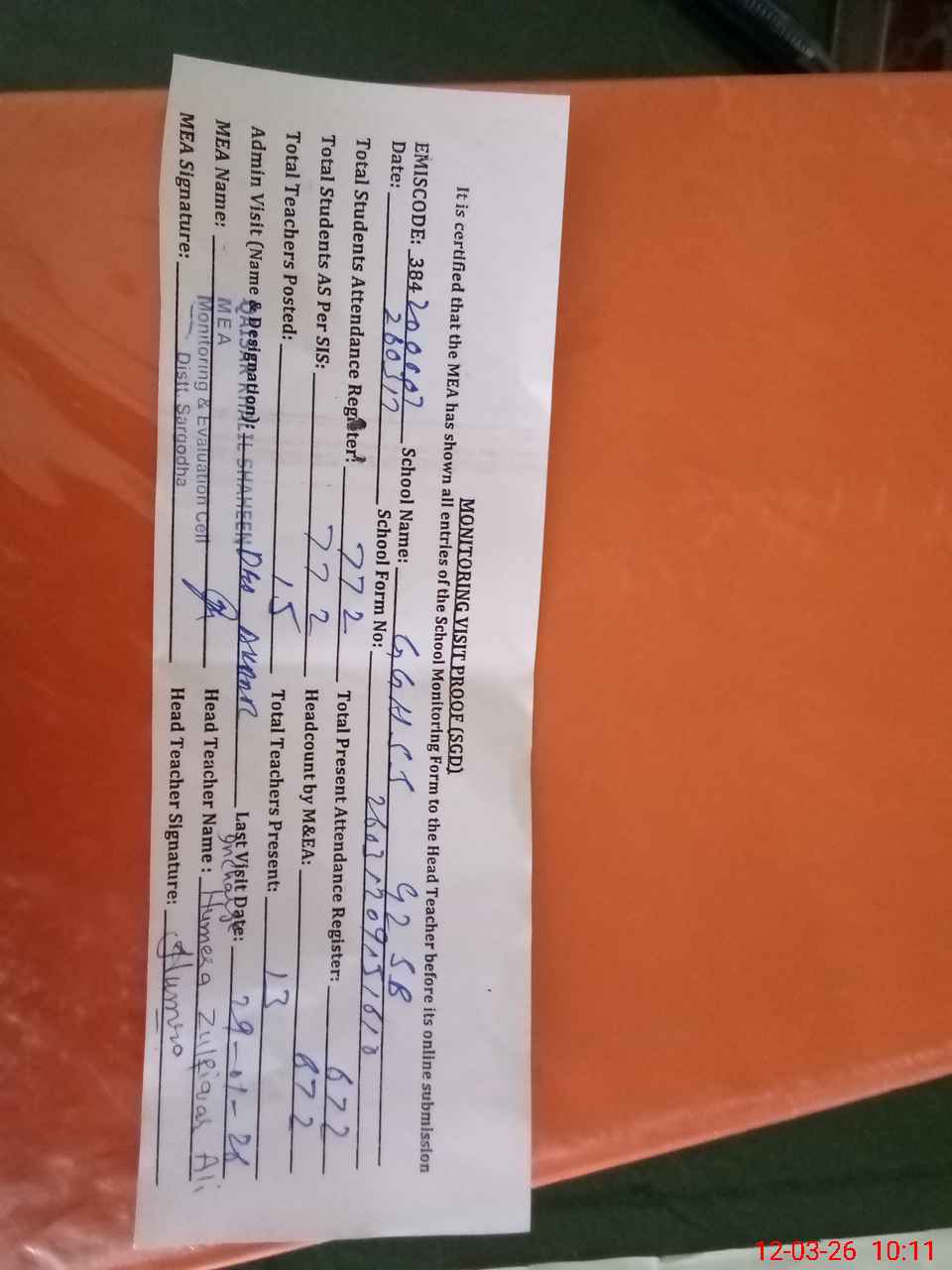 | Attendance Register | Head Teacher | MEA with School | Visit Proof |