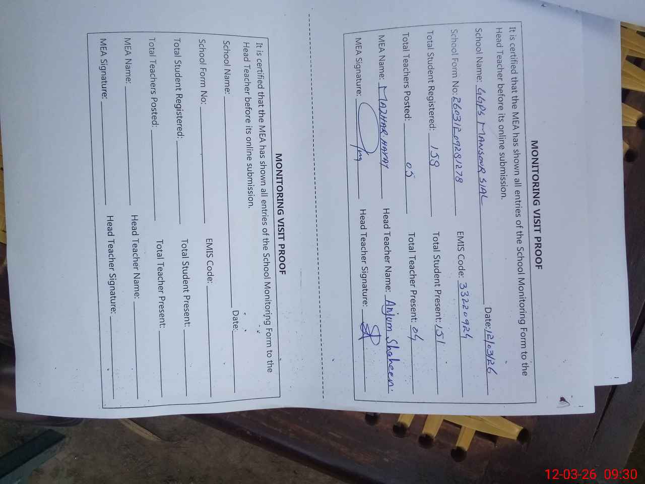 | Attendance Register | Head Teacher | MEA with School | Visit Proof |