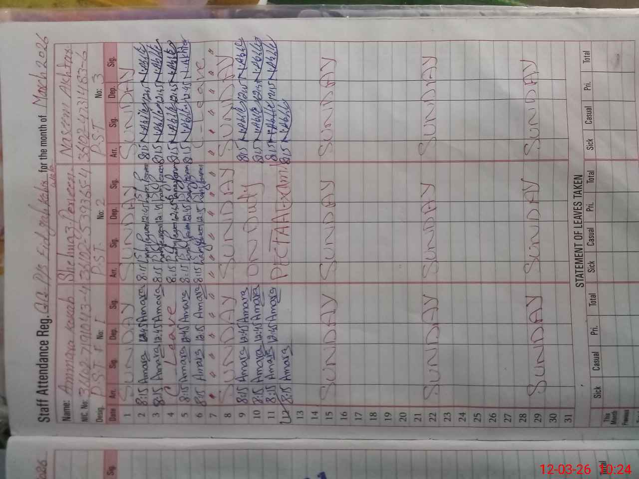 | CNIC | Full Name | Designation | R/C | Absence During Last Calender Month |