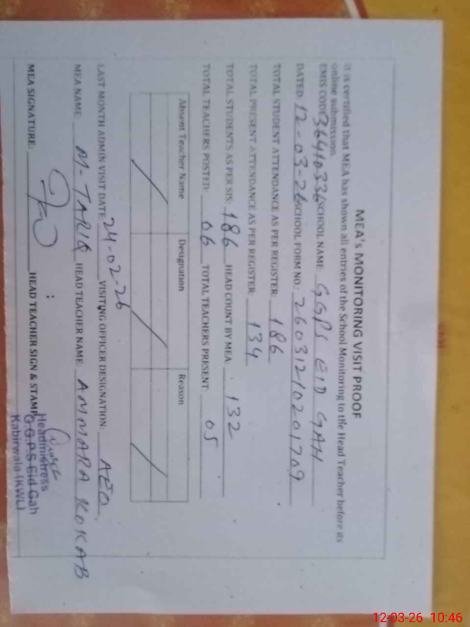 | Attendance Register | Head Teacher | MEA with School | Visit Proof |