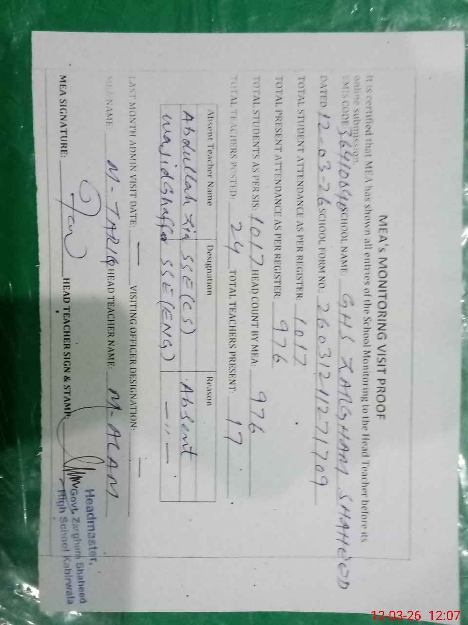 | Attendance Register | Head Teacher | MEA with School | Visit Proof |