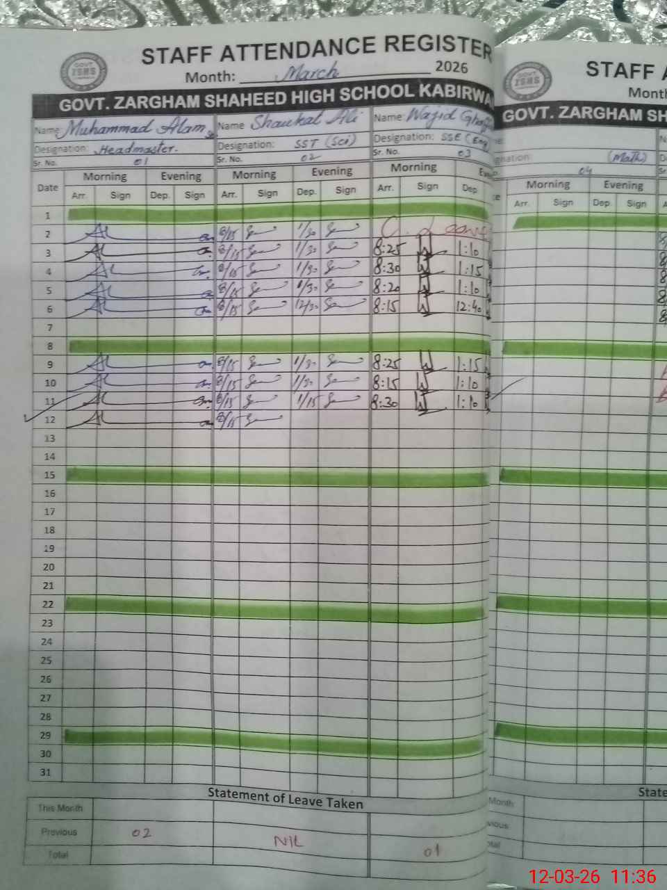 | 36**** | Wa**** Gh**** | SSE English | Contract | 0 | 0 | 0 | 0 | 0 | 0 | 0 | 0 | 0 | Absent (Un-Authorized) |