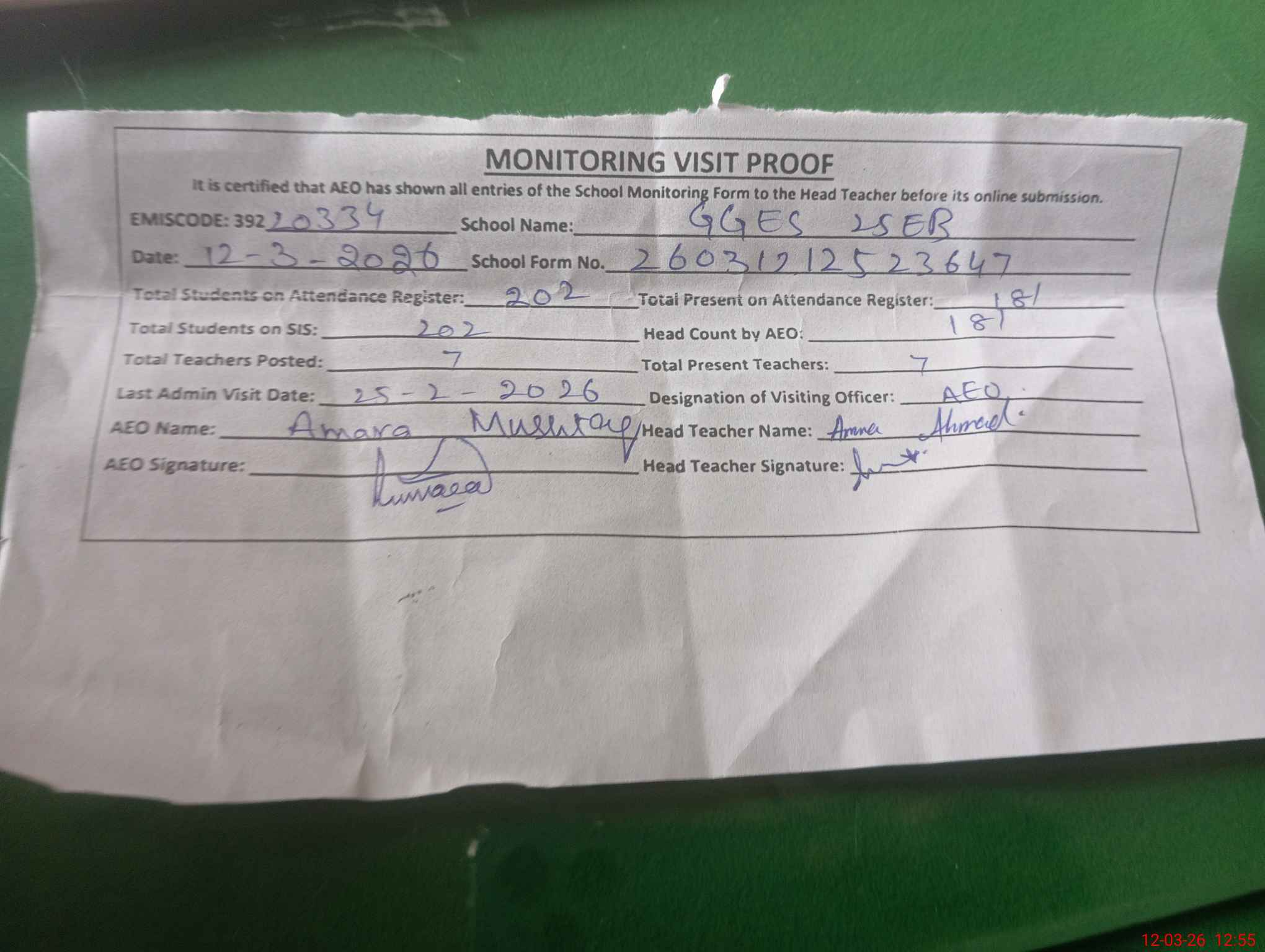 | Attendance Register | Head Teacher | MEA with School | Visit Proof |