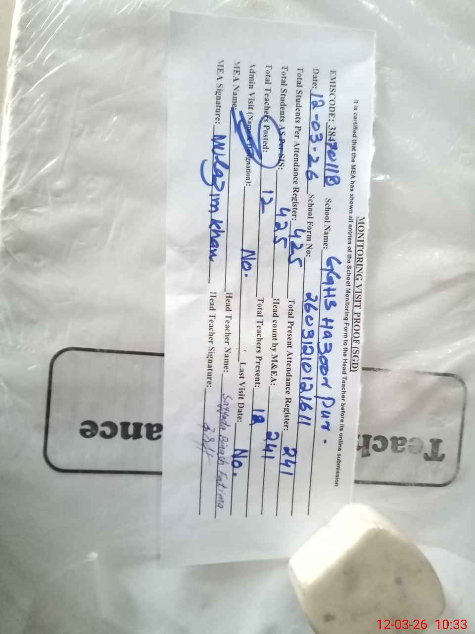 | Attendance Register | Head Teacher | MEA with School | Visit Proof |