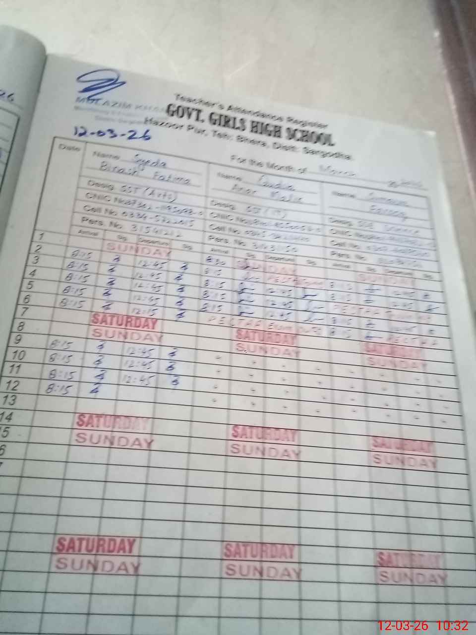 | CNIC | Full Name | Designation | R/C | Absence During Last Calender Month |
