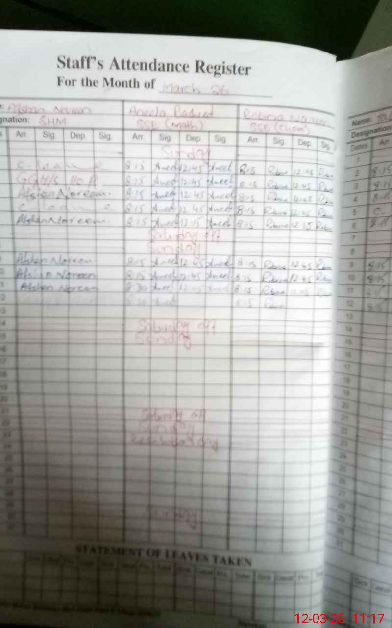 | 31**** | Gh**** Mu**** | BAILDAR | Regular | 0 | 0 | 28 | 0 | 0 | 0 | 0 | 0 | 0 | Absent (Un-Authorized) |