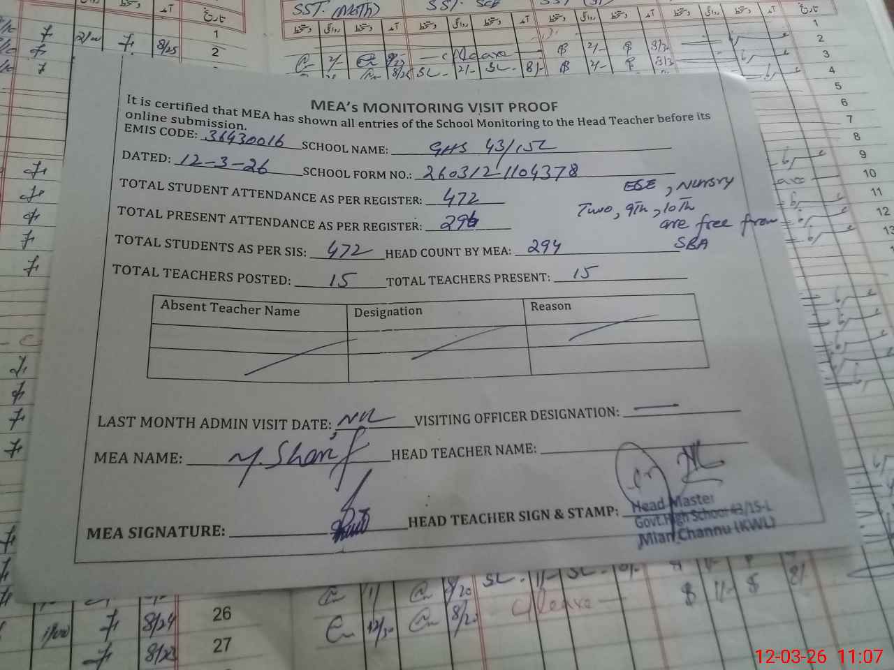 | Attendance Register | Head Teacher | MEA with School | Visit Proof |