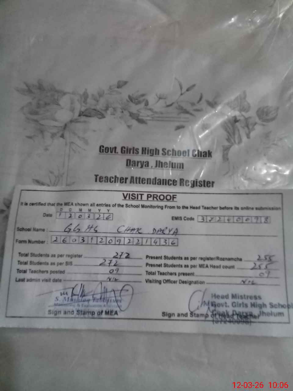 | Attendance Register | Head Teacher | MEA with School | Visit Proof |