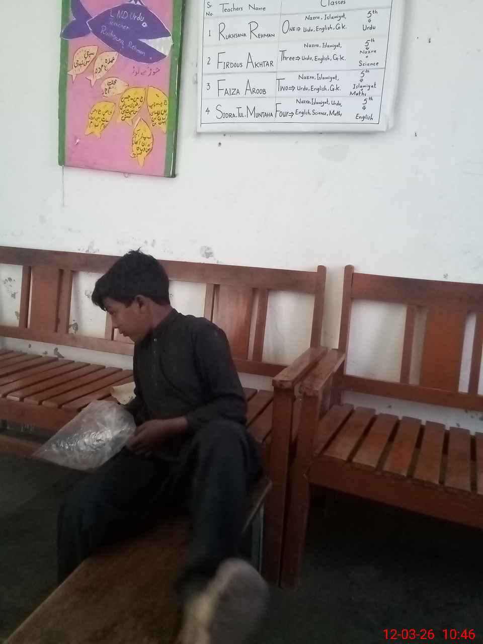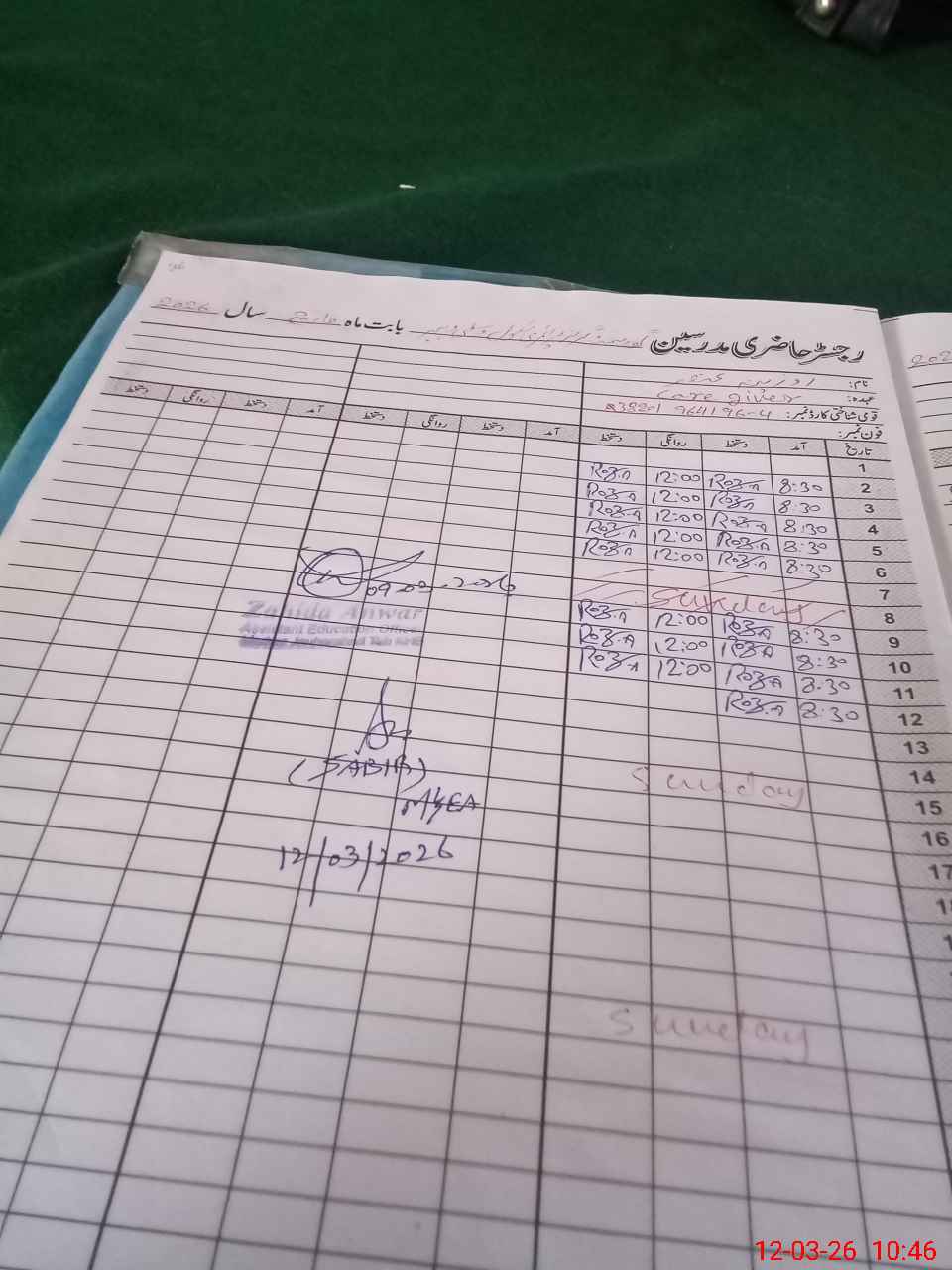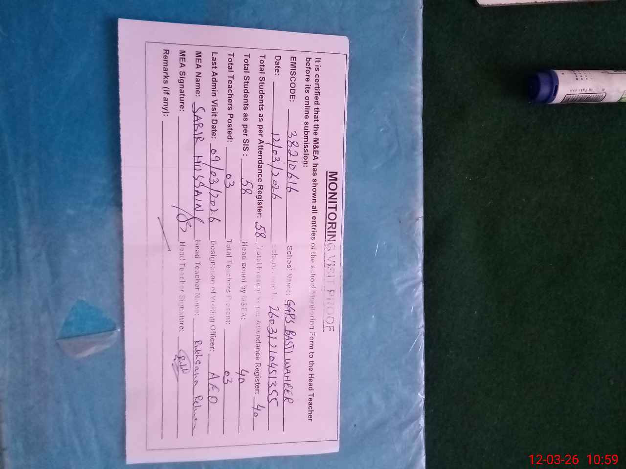| Remarks (Use Separate Page if Required): no teacher absent total students on register 58 total students on SiS 58 last admin visit by AEO on 09 Mar 2026 | |||||