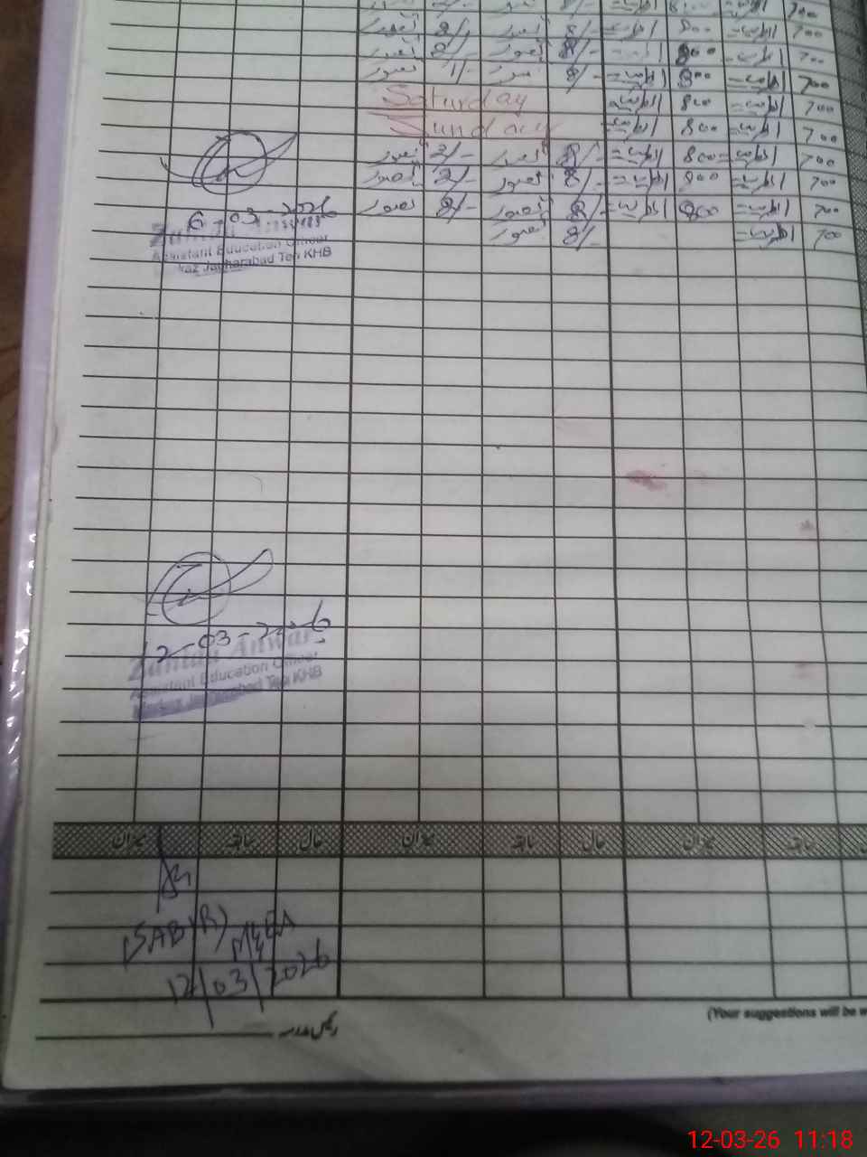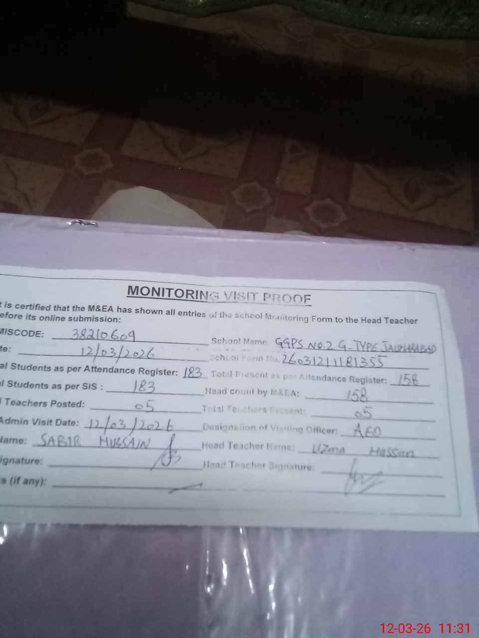 | Remarks (Use Separate Page if Required): no teacher absent total students on register 183 total students on SiS 183 last admin visit by AEO on 12 Mar 2026 | |||||
