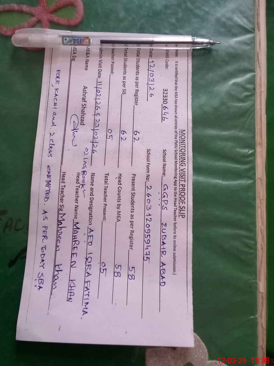 | Attendance Register | Head Teacher | MEA with School | Visit Proof |