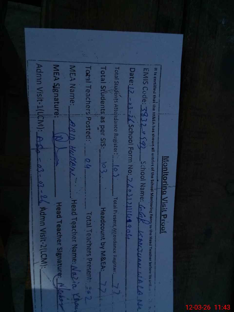 | Attendance Register | Head Teacher | MEA with School | Visit Proof |