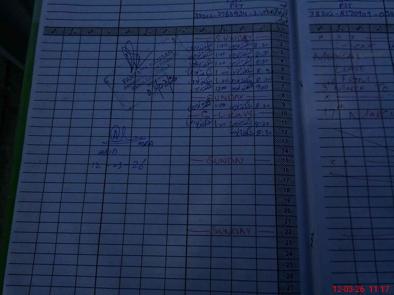 | CNIC | Full Name | Designation | R/C | Absence During Last Calender Month |