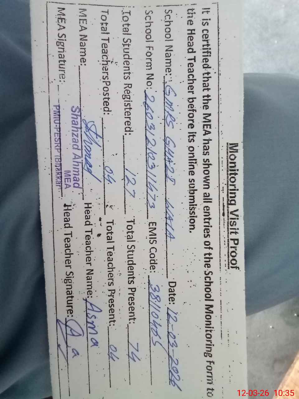 | EMIS Code: 38110465 | Name of School: GMPS GHAZI WALA | |||