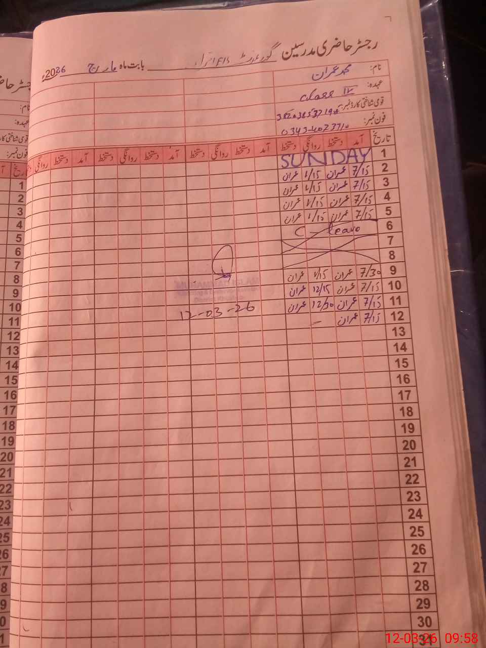 | CNIC | Full Name | Designation | R/C | Absence During Last Calender Month |