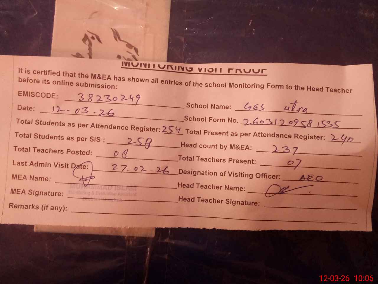 | Remarks (Use Separate Page if Required): AEO visited school on 27 February 2026 students strength on sis 254 Headmaster Qaisar Sohail absent from school but attendance mark on register while no entry in order book | |||||