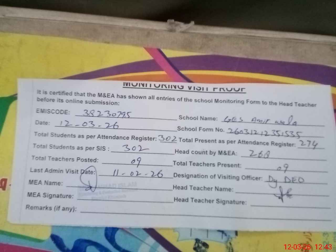 | Remarks (Use Separate Page if Required): Dy DEO visited school on 11 February 2026 students strength on sis 302 | |||||
