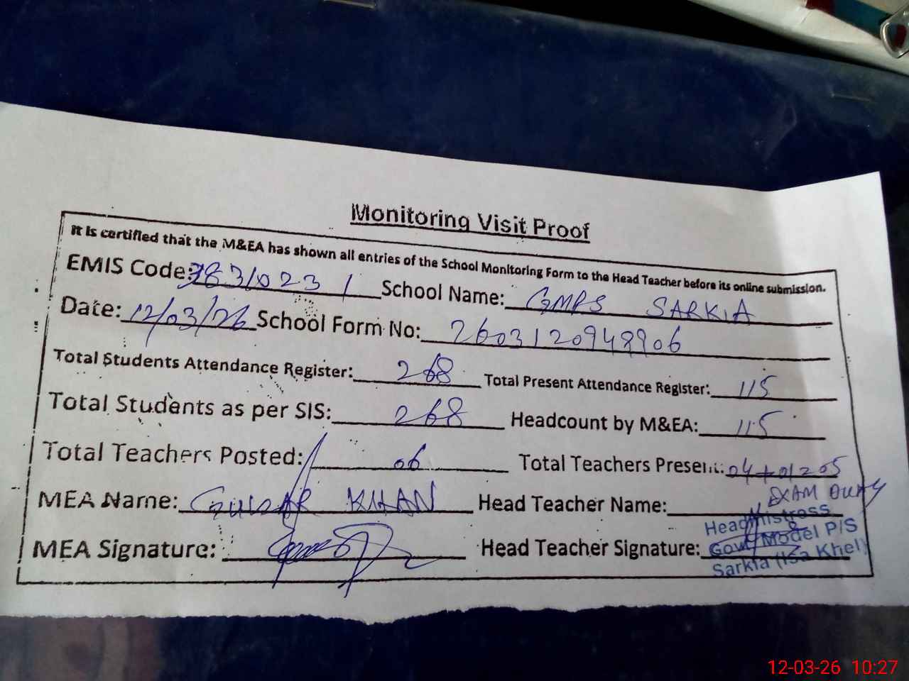 | Attendance Register | Head Teacher | MEA with School | Visit Proof |