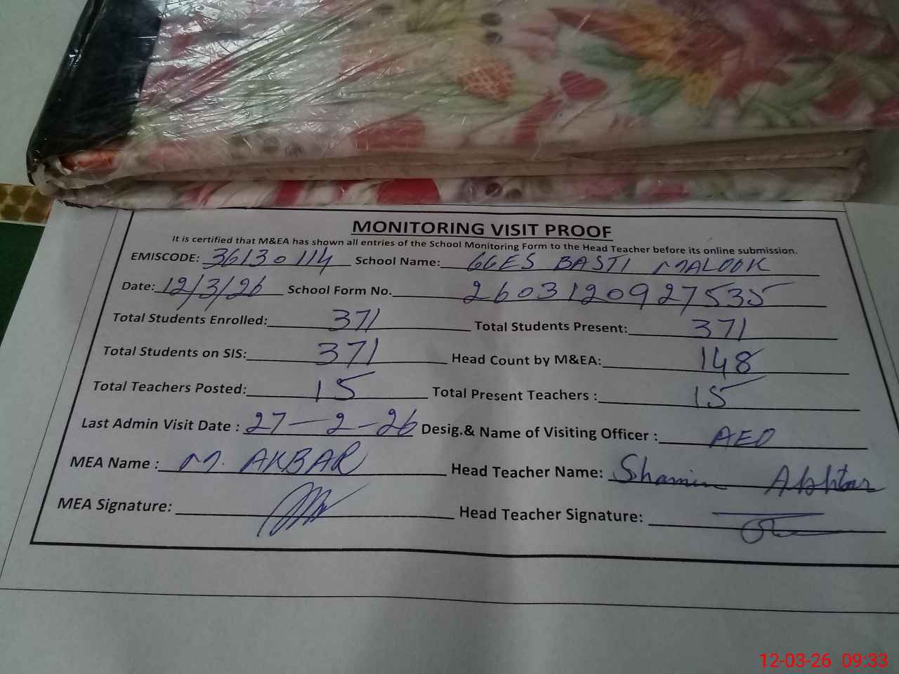 | Attendance Register | Head Teacher | MEA with School | Visit Proof |