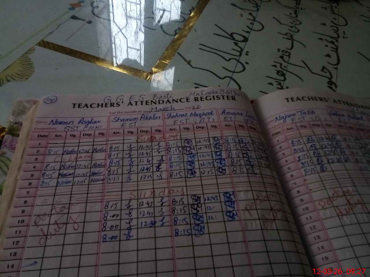 | 36**** | Na**** Ta**** | EST Urdu | Regular | 0 | 0 | 0 | 0 | 0 | 0 | 0 | 0 | 0 | Exam Duty |
