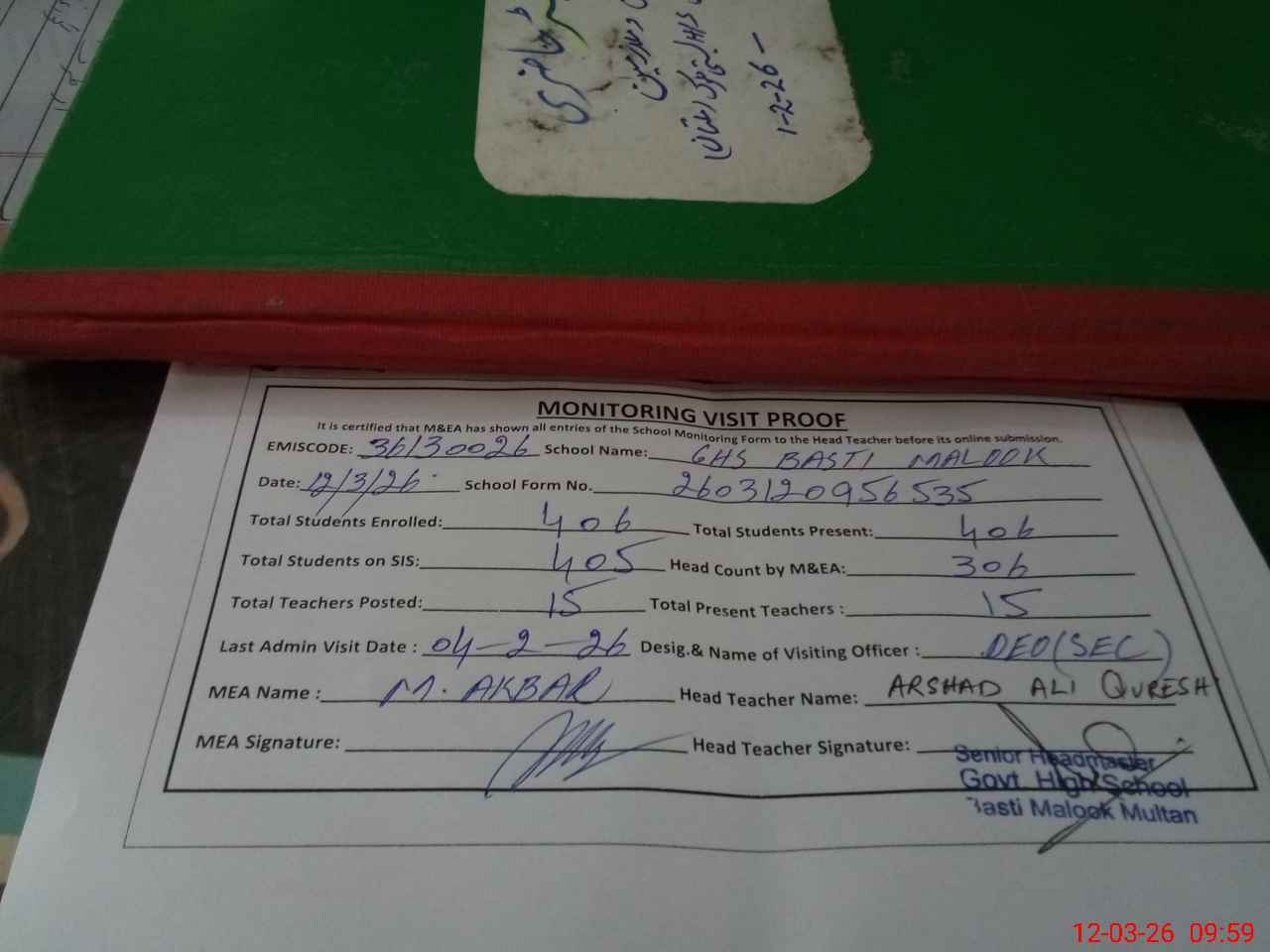 | Attendance Register | Head Teacher | MEA with School | Visit Proof |