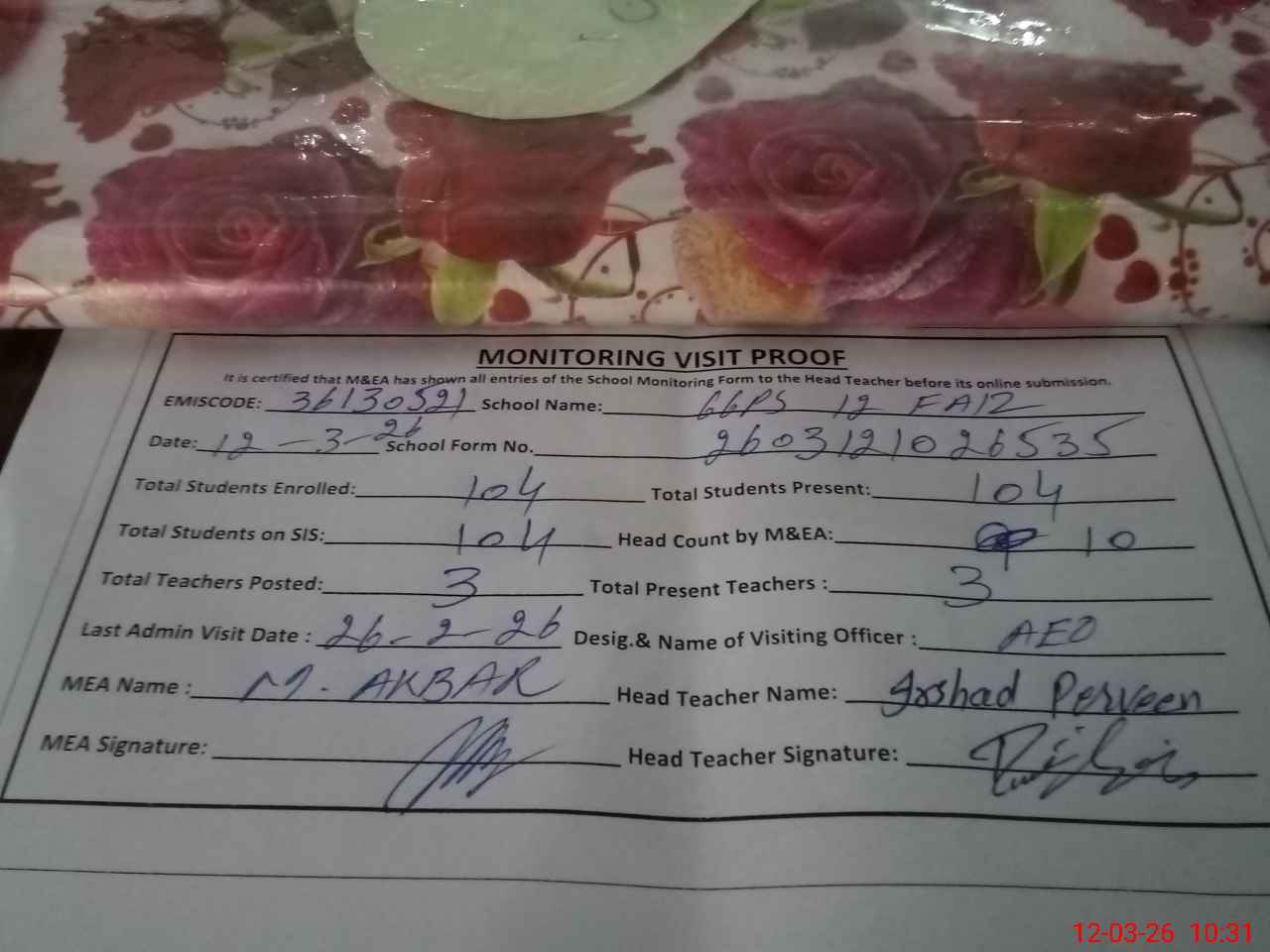 | Attendance Register | Head Teacher | MEA with School | Visit Proof |