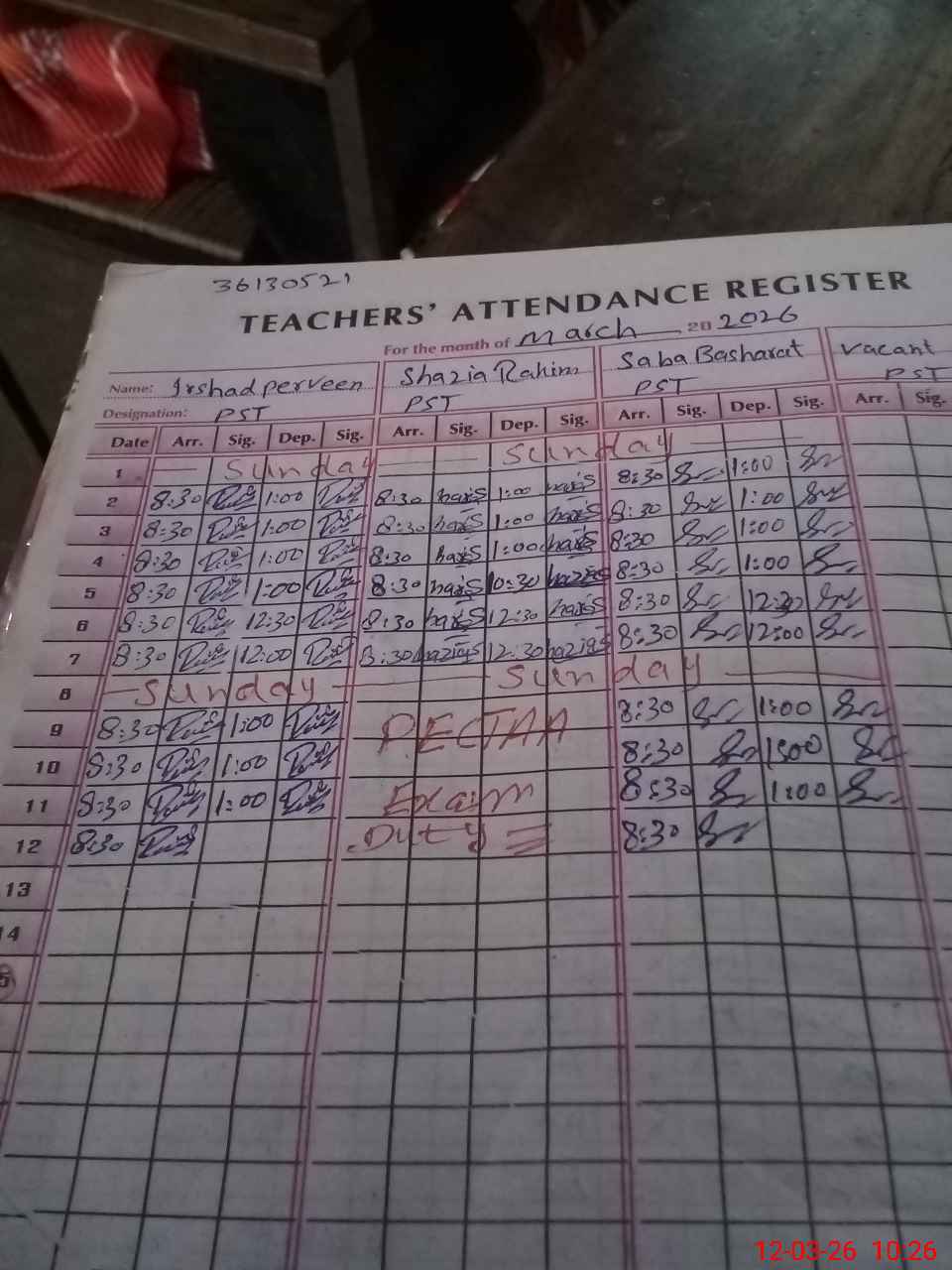 | 36**** | Sh**** Ra**** | PST Arts | Regular | 0 | 0 | 0 | 0 | 0 | 0 | 0 | 0 | 0 | Exam Duty |