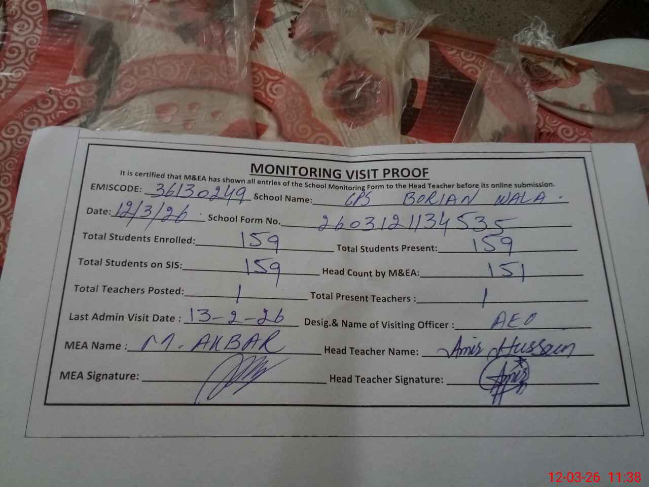 | Attendance Register | Head Teacher | MEA with School | Visit Proof |