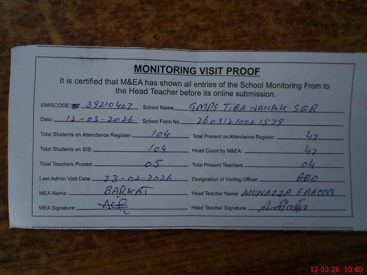 | EMIS Code: 39210407 | Name of School: GMPS TIBBA NANAK SER | |||