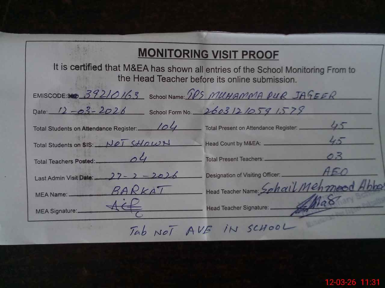 | Attendance Register | Head Teacher | MEA with School | Visit Proof |