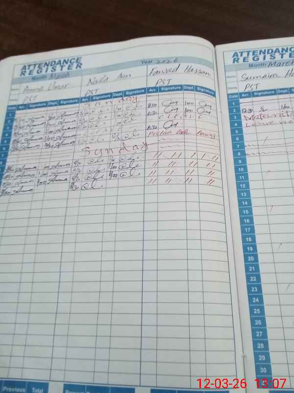 | CNIC | Full Name | Designation | R/C | Absence During Last Calender Month |