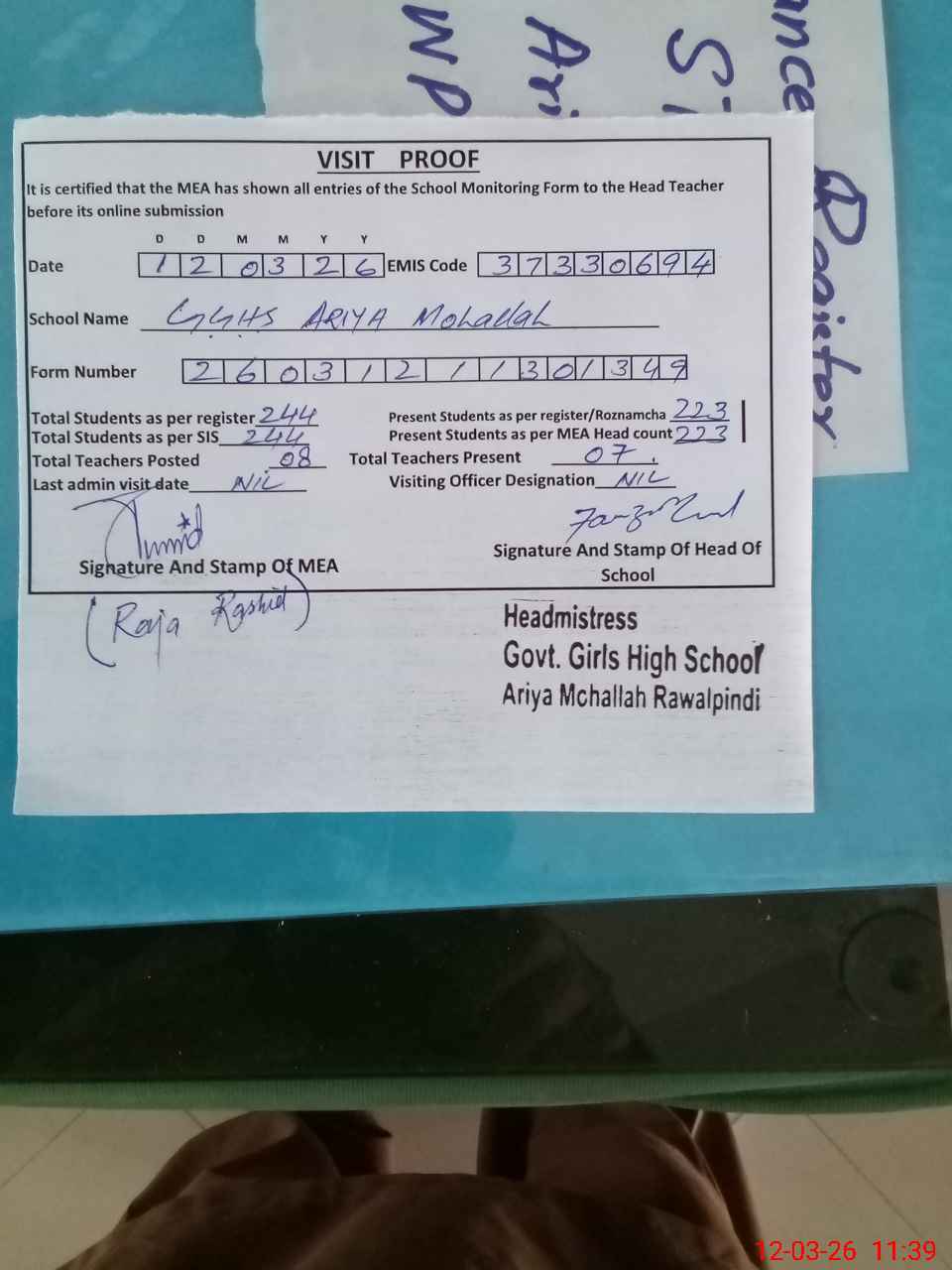 | Attendance Register | Head Teacher | MEA with School | Visit Proof |