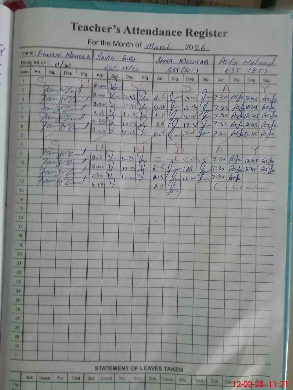 | Leave | Duty | Absent | Maternity | Medical | Ex- Pak |