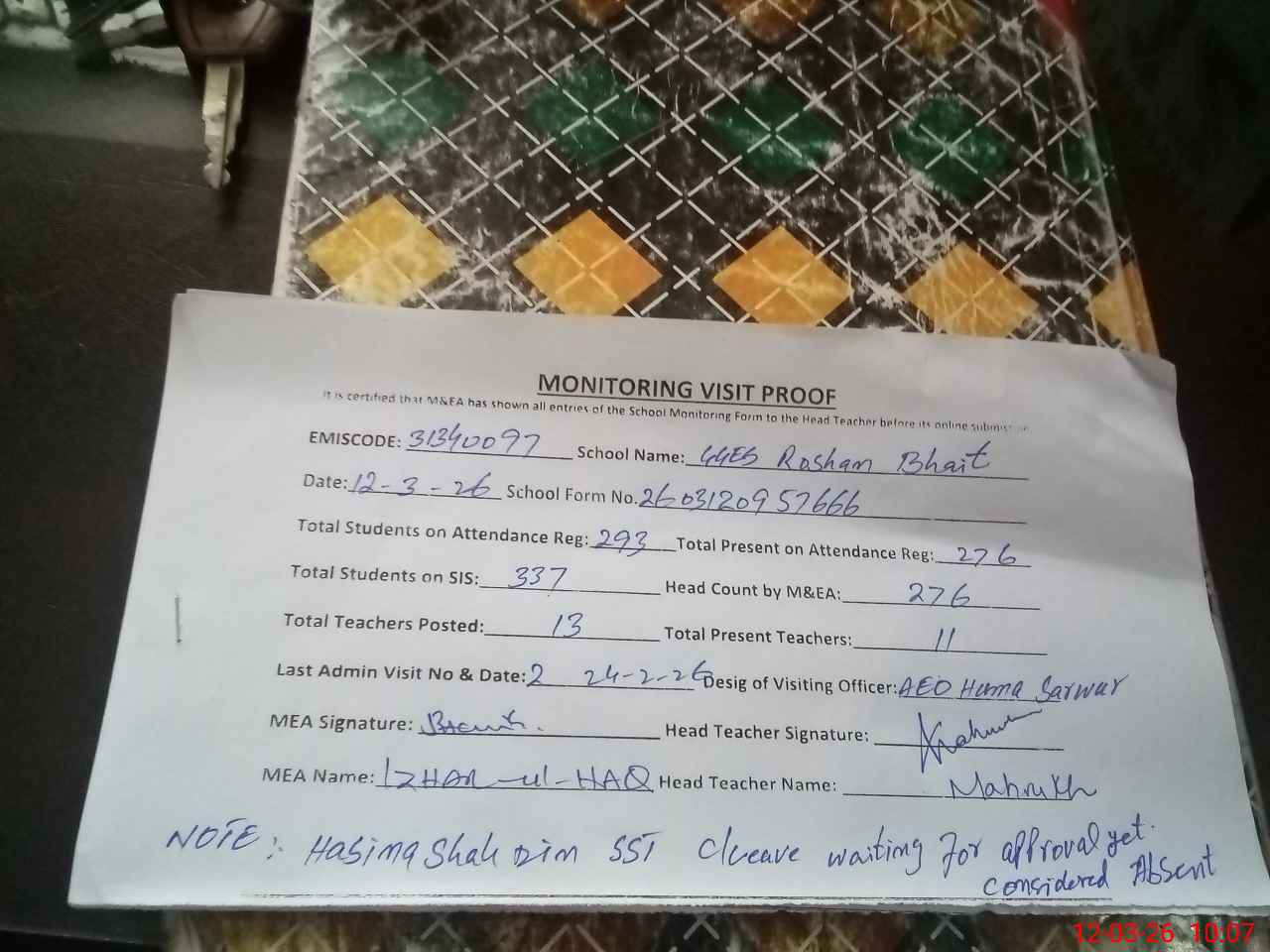 | Attendance Register | Head Teacher | MEA with School | Visit Proof |
