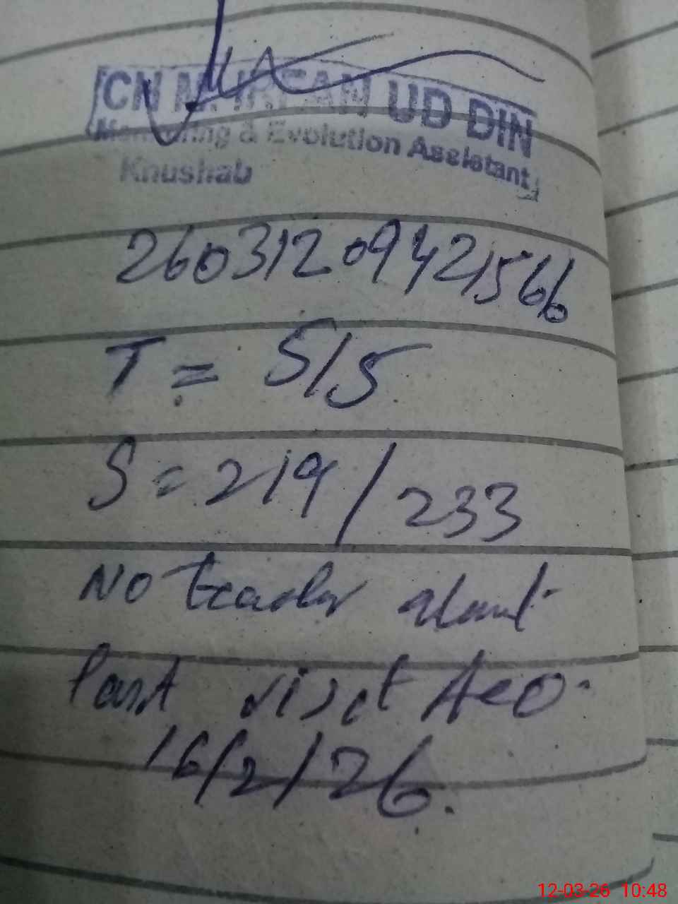| Remarks (Use Separate Page if Required): ggps railwastation quaudabad student on sis 233 student on register 233 head count 219 no teacher absent last visit aeo 16/2/26 boundary wall under construction | |||||