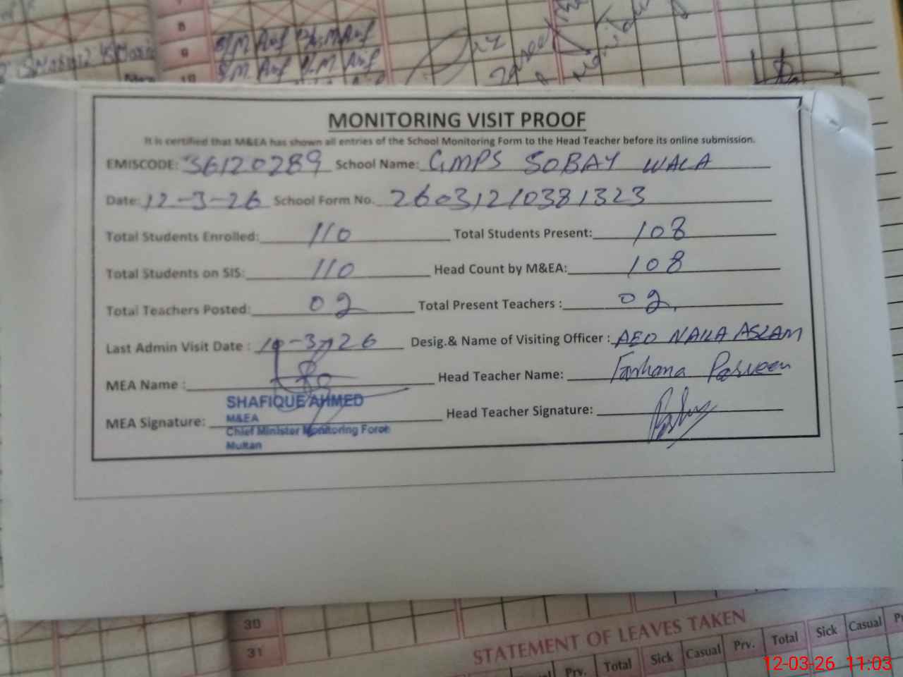 | EMIS Code: 36120289 | Name of School: GMPS SOBAY WALA | |||