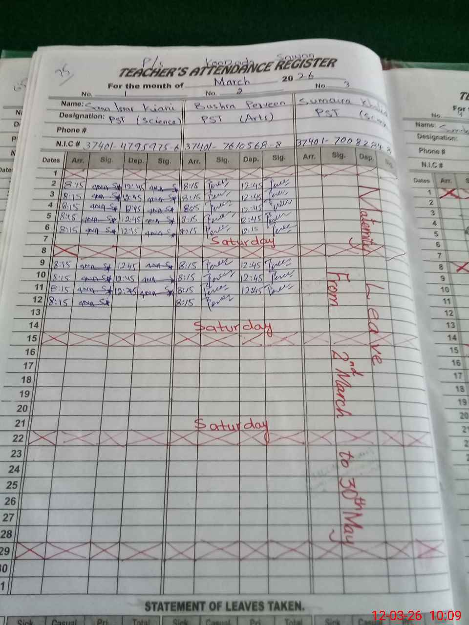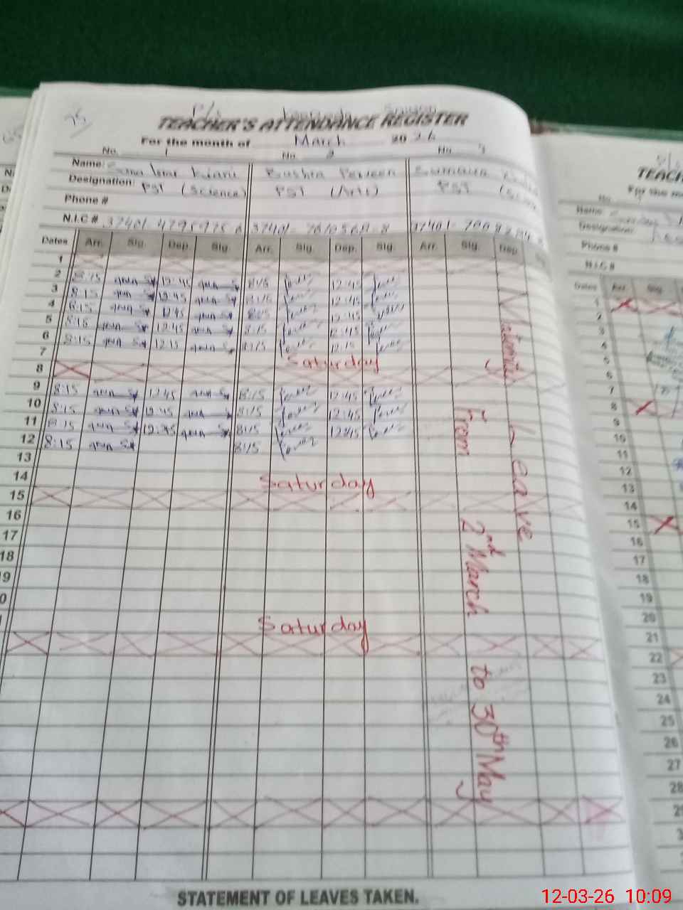 | 37**** | Su**** Kh**** | PST Science/Maths | Regular | 0 | 0 | 0 | 0 | 0 | 0 | 0 | 0 | 0 | Maternity |