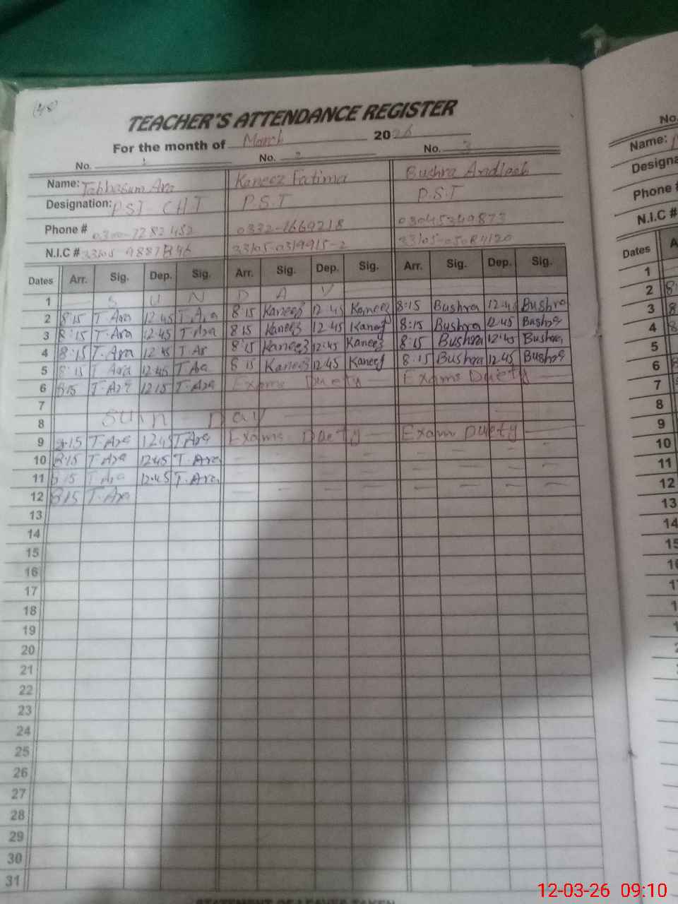 | Name: Ta**** Ar**** Designation: (School Headmaster's/Headmistress's) PST Phone/Cell Number: 03**** |