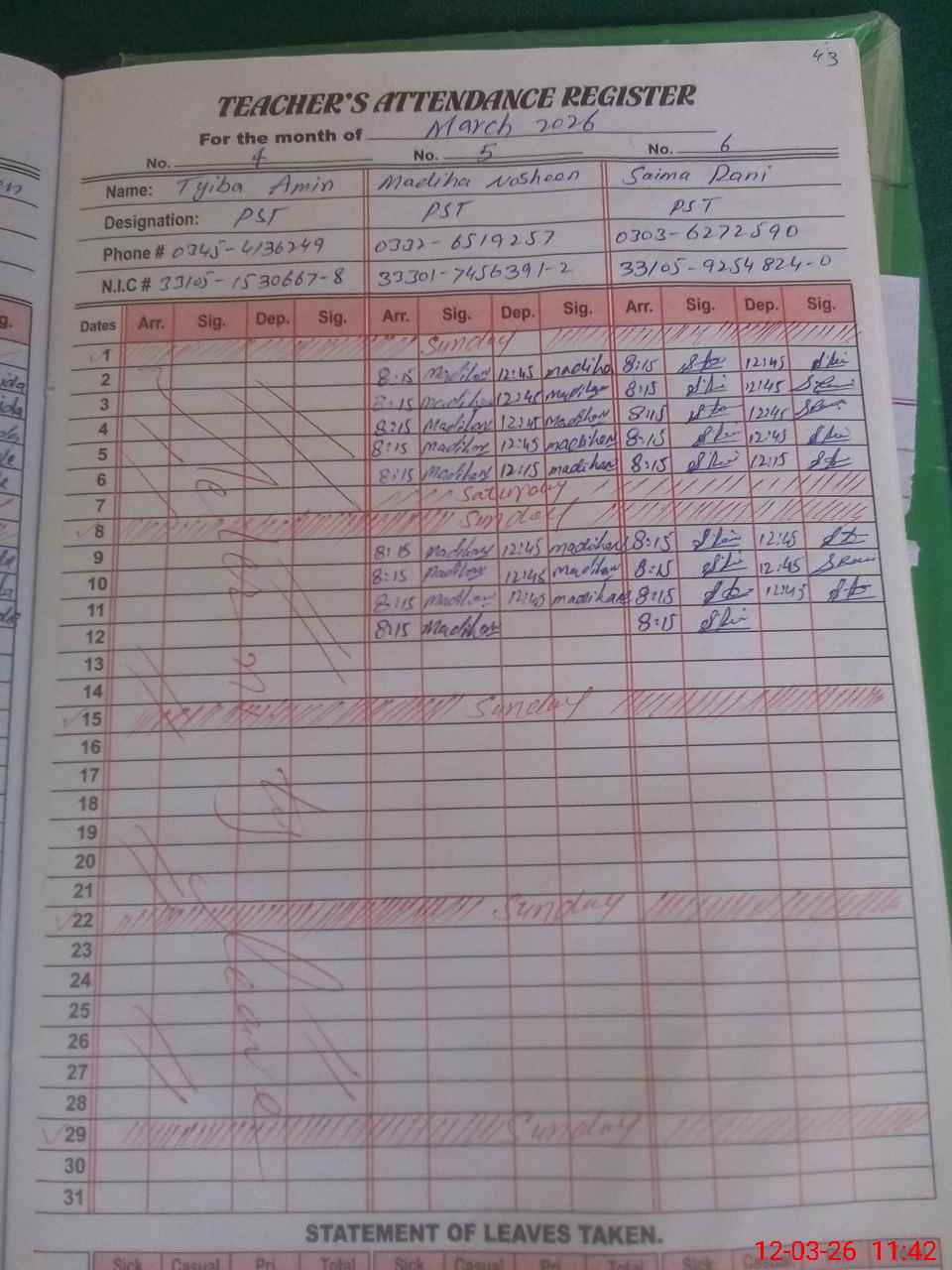 | 33**** | Ty**** Am**** | PST Science/Maths | Regular | 0 | 0 | 0 | 0 | 0 | 0 | 0 | 0 | 0 | Maternity |