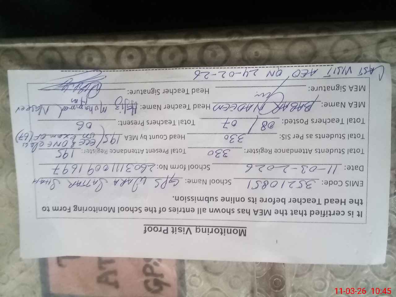 | Remarks (Use Separate Page if Required): 1 Muhammad Mubeen Watchman on emergency leave and the keys of Almirah with him according to Headmaster statement so does no record was shown 2 Muhammad Arshad PST marked on leave but no record of leave available so according to SOPs marked him absent 3 There is a One Washroom under construction since 23 October 2025 | |||||