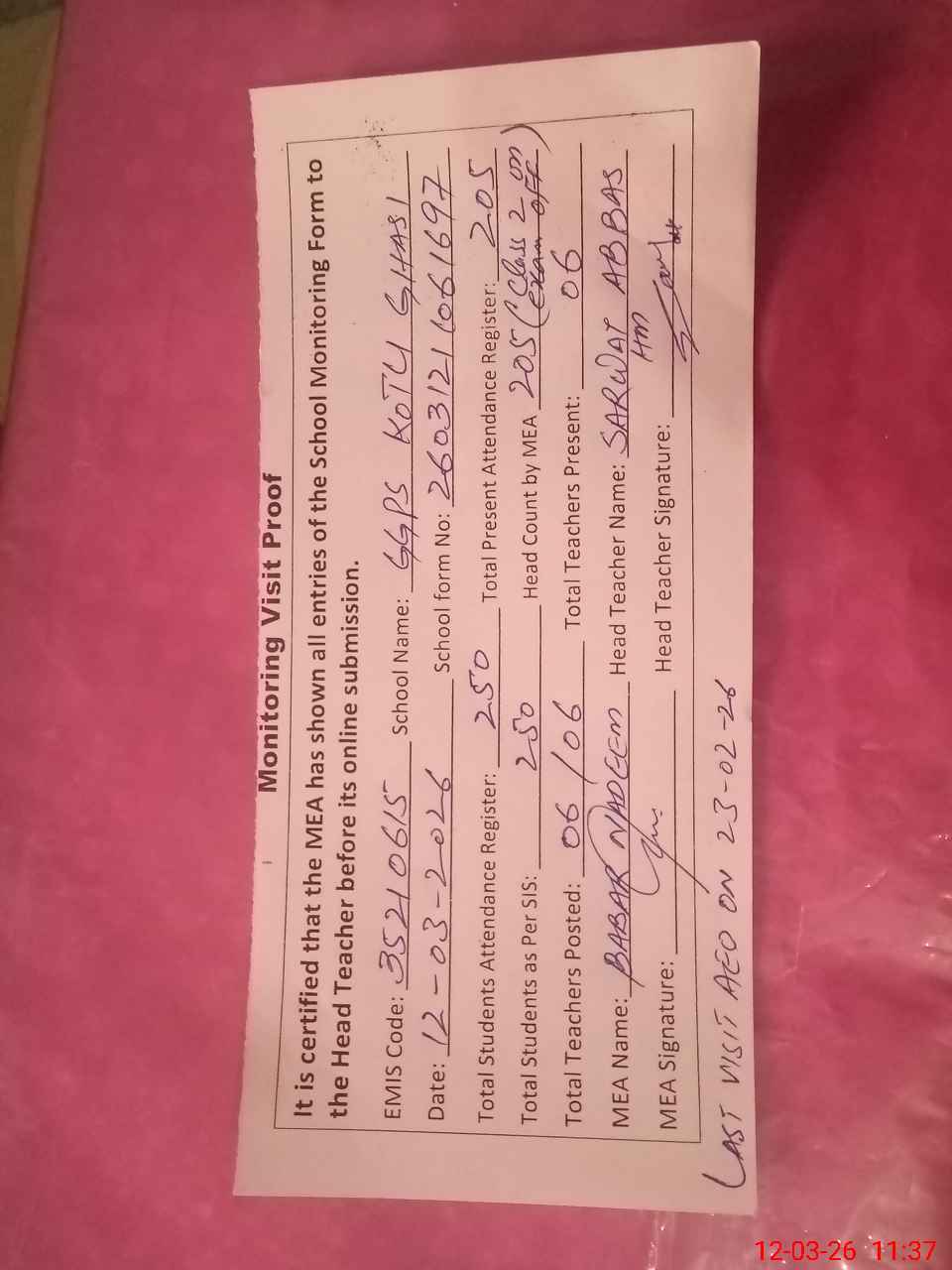 | Attendance Register | Head Teacher | MEA with School | Visit Proof |