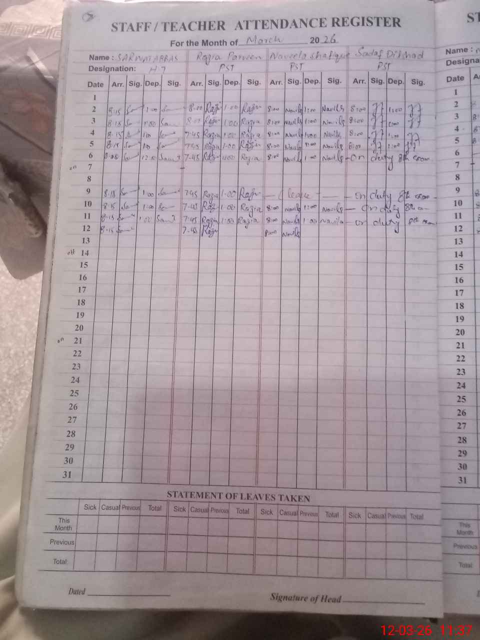 | Leave | Duty | Absent | Maternity | Medical | Ex- Pak |