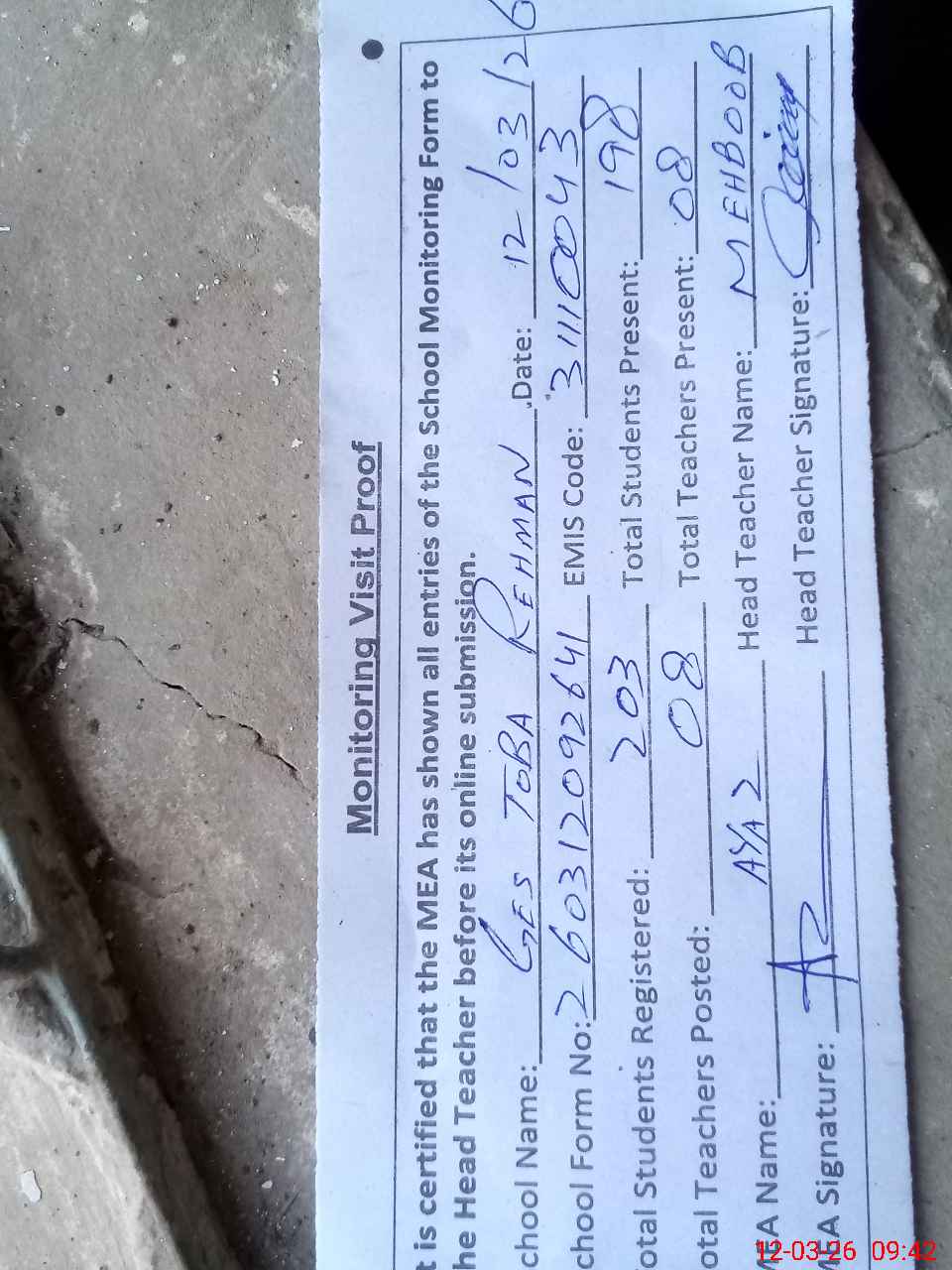 | Attendance Register | Head Teacher | MEA with School | Visit Proof |