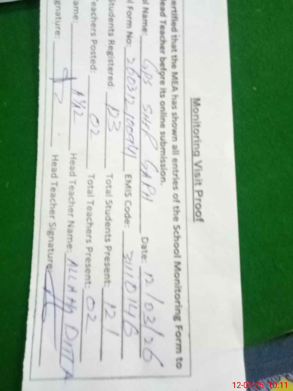 | Attendance Register | Head Teacher | MEA with School | Visit Proof |