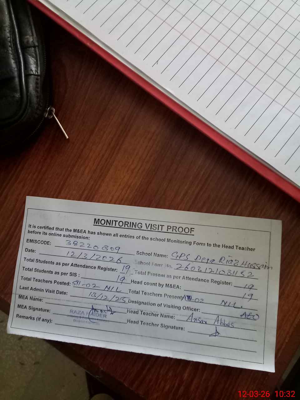| Attendance Register | Head Teacher | MEA with School | Visit Proof |