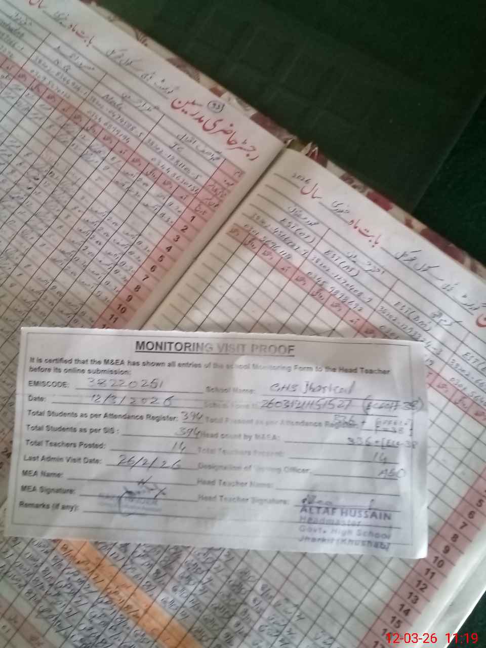 | Attendance Register | Head Teacher | MEA with School | Visit Proof |