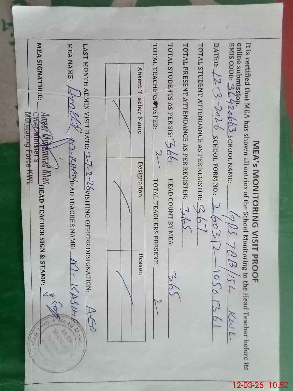 | EMIS Code: 36420663 | Name of School: GPS 78-B/15-L, KHANEWAL | |||