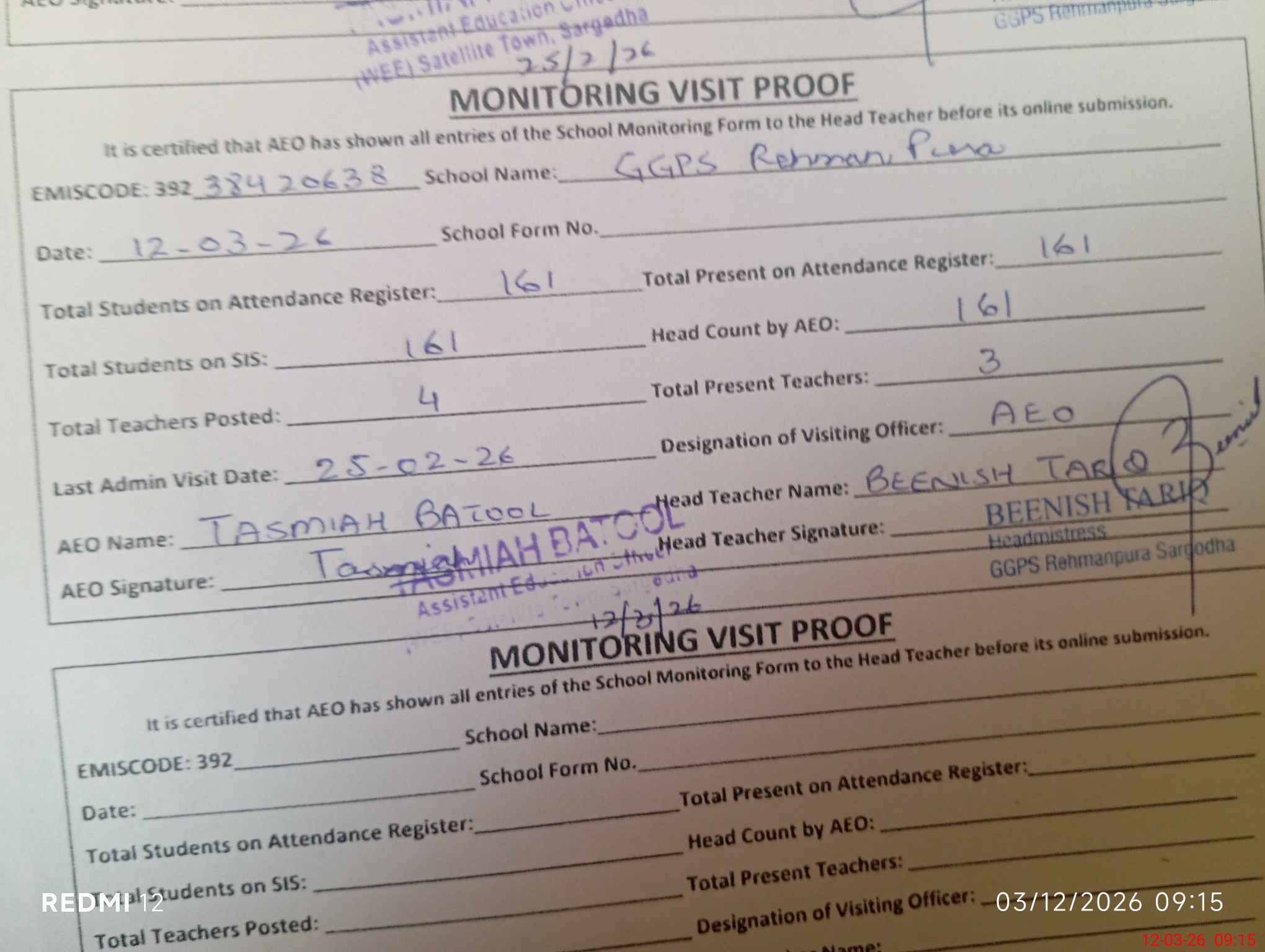 | Attendance Register | Head Teacher | MEA with School | Visit Proof |